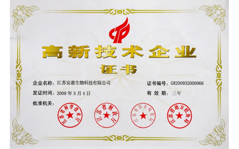 2009年3月4日,安惠公司成為國家高新技術企業。