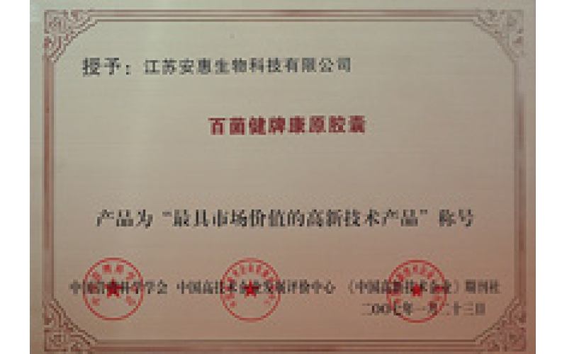 2007年1月24日,安惠百菌健牌康原膠囊產品獲得中國管理科學學會、中國高技術企業發展評價中心、中國高新技術企業期刊社聯合評定的“最具市場價值的高新技術產品”榮譽稱號。同時,百菌健牌康原膠囊還與公司的另一產品——靈芝孢子蟲草菌絲體粉攜手獲得“江蘇省名牌產品”榮譽稱號。