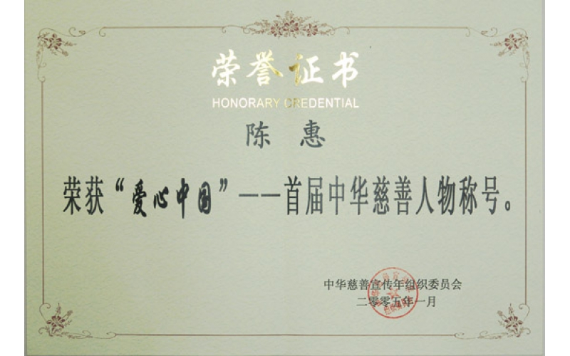 2005年1月31日,中華慈善總會(huì)在北京民族飯店召開新聞發(fā)布會(huì),陳惠董事長(zhǎng)當(dāng)選“愛心中國(guó)”——首屆中華慈善人物。